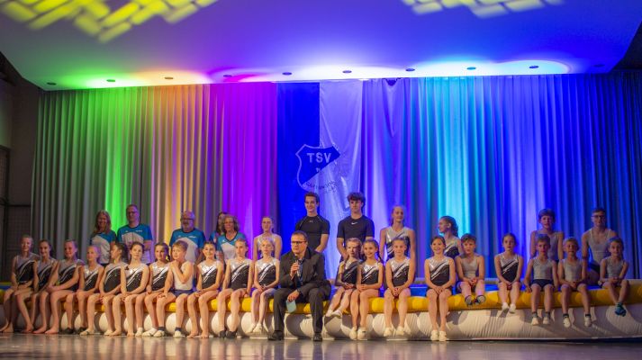 Einen tollen Abschluss des Bühnenprogramms bot die Turnabteilung mit einem actionreichen Auftritt auf dem Airtrack. Die Turnjugend begeisterte dabei mit einer bunten Mischung aus Sprüngen, Saltos und Flickflacks. Aber auch die Gäste wurden ins Programm mit einbezogen: ganz offiziell durfte das Smartphone gezückt werden, um bei einem Online-Quiz zu beweisen, wie gut die Gäste den TSV kennen. Nach dem offiziellen Programm konnten die Gäste mit einem Glas Sekt auf den Jubilar anstoßen und sich beim „Get-Together“ mit Häppchen und Getränken noch rege austauschen.