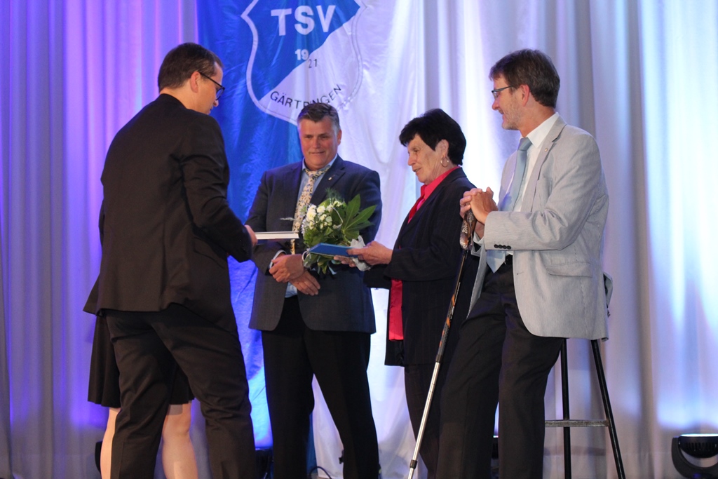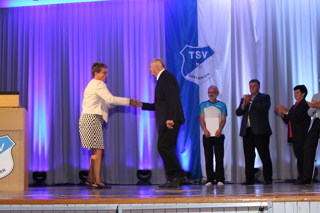 Mit knapp 1200 Mitgliedern ist er der größten Verein in Gärtringen. Dass der Verein trotz seiner 100 Jahre jung und vor allem weiblich ist, hob Bürgermeister Thomas Riesch in seiner Laudatio hervor und zückte dabei sein Mobiltelefon, um dies zugleich mit Zahlen aus der aktuellen TSV Rundschau online zu belegen. „Der TSV ist ein Verein mit einem starken Ehrenamt und hervorragender hauptamtlicher Struktur“ so Bürgermeister Riesch. Zum Abschluss überreichte er einen Jubiläumsscheck und versprach, dass die Gemeinde auch die kommenden 100 Jahre an der Seite des Vereins stehen wird. Auch der Sportkreisvorsitzende Ekkehard Fauth, der im Anschluss seine besten Wünsche überbrachte, kam nicht mit leeren Händen. Nach einem mitreißenden Auftritt der Abteilung Jazz- und Modern Dance „TanZeitLos“ des TSV erläuterte Michaela Netzer-Voit, STB Vizepräsidentin Sportarten, wie wichtig die soziale Komponente eines Sportvereins ist und diesen damit zu einem unverzichtbaren Teil unserer Zivilgesellschaft macht. Sie brachte als „Geburtstagsgeschenk“ unter anderem einen Gutschein für einen Zukunftsworkshop mit.